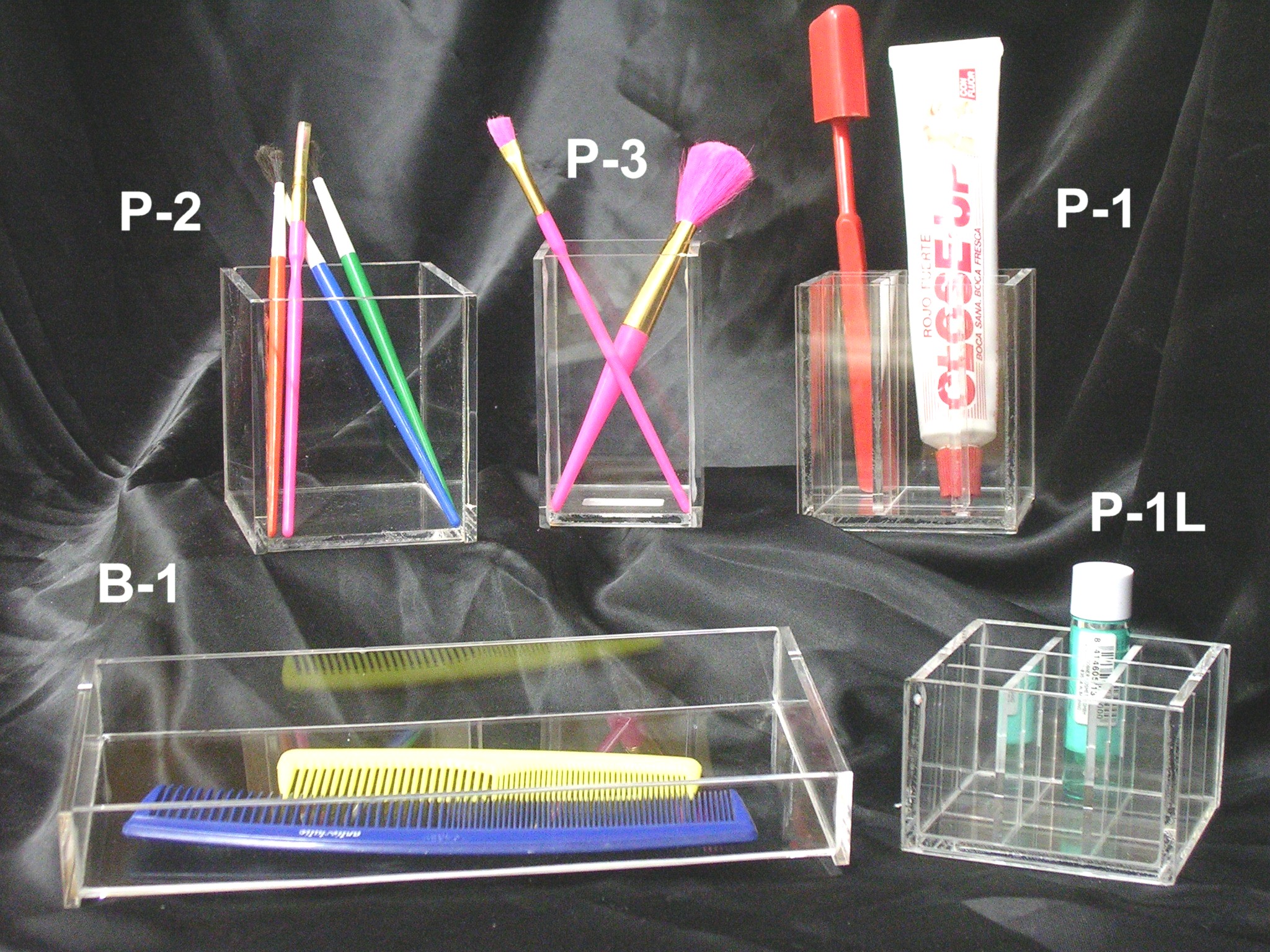 Pinceleros con y sin departamentos, ideales para la pasta de dientes, el cepillo, pinceles para maquillar, etc. Bandeja plana.